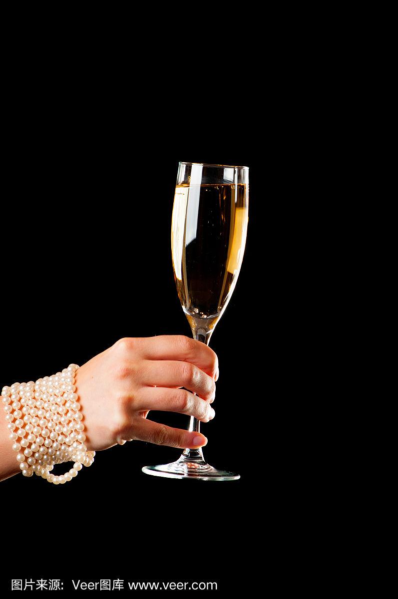 在酒吧餐厅,手里拿着酒杯,桌上放着酒瓶