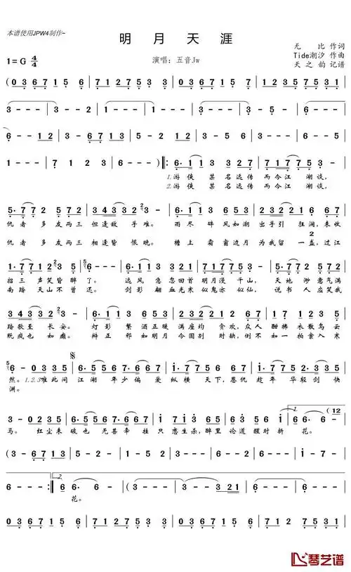 明月天涯简谱(歌词)-五音jw演唱-天之韵记谱1