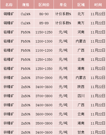 11.22有色矿产及金属价格汇总