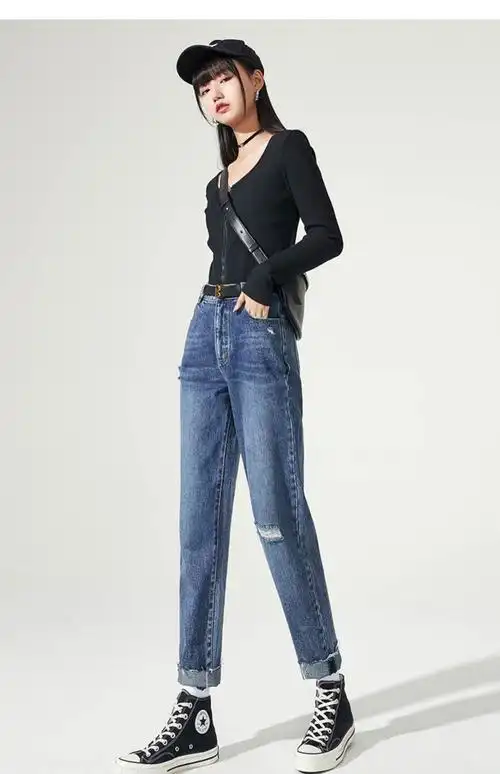 teze品牌女装牛仔裤女直筒宽松2021春新款女士高腰显瘦破洞烟管老爹裤