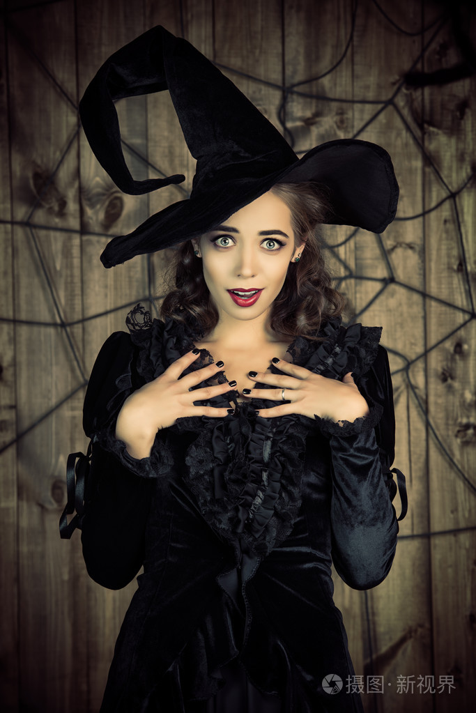 半长的肖像美丽的年轻女子在巫婆的礼服把咒语用魔杖