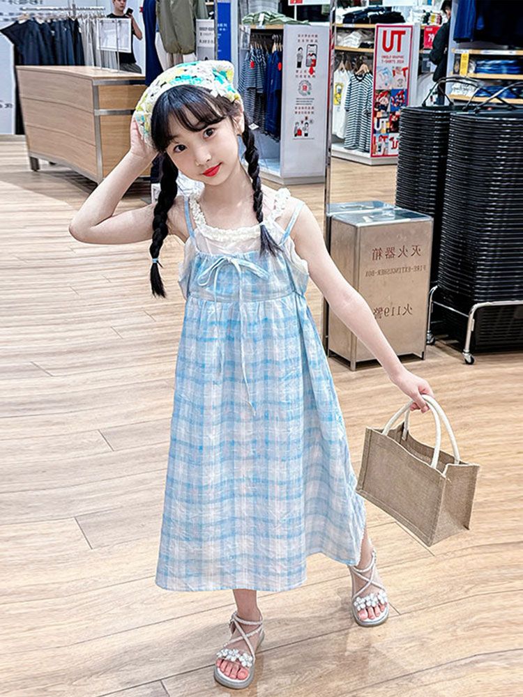 女童连衣裙新款夏季儿童时尚可爱格子无袖修身公主裙童装 配帽子