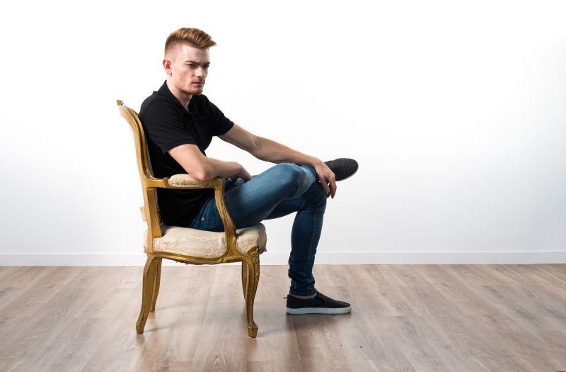 白色背景下坐在扶手椅子上翘着二郎腿的男人