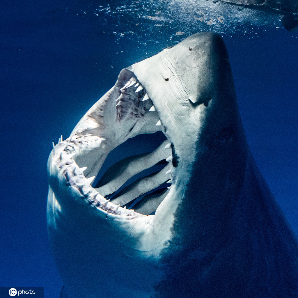 摄影师近距离拍摄凶猛鲨鱼血盘大口龇牙咧嘴