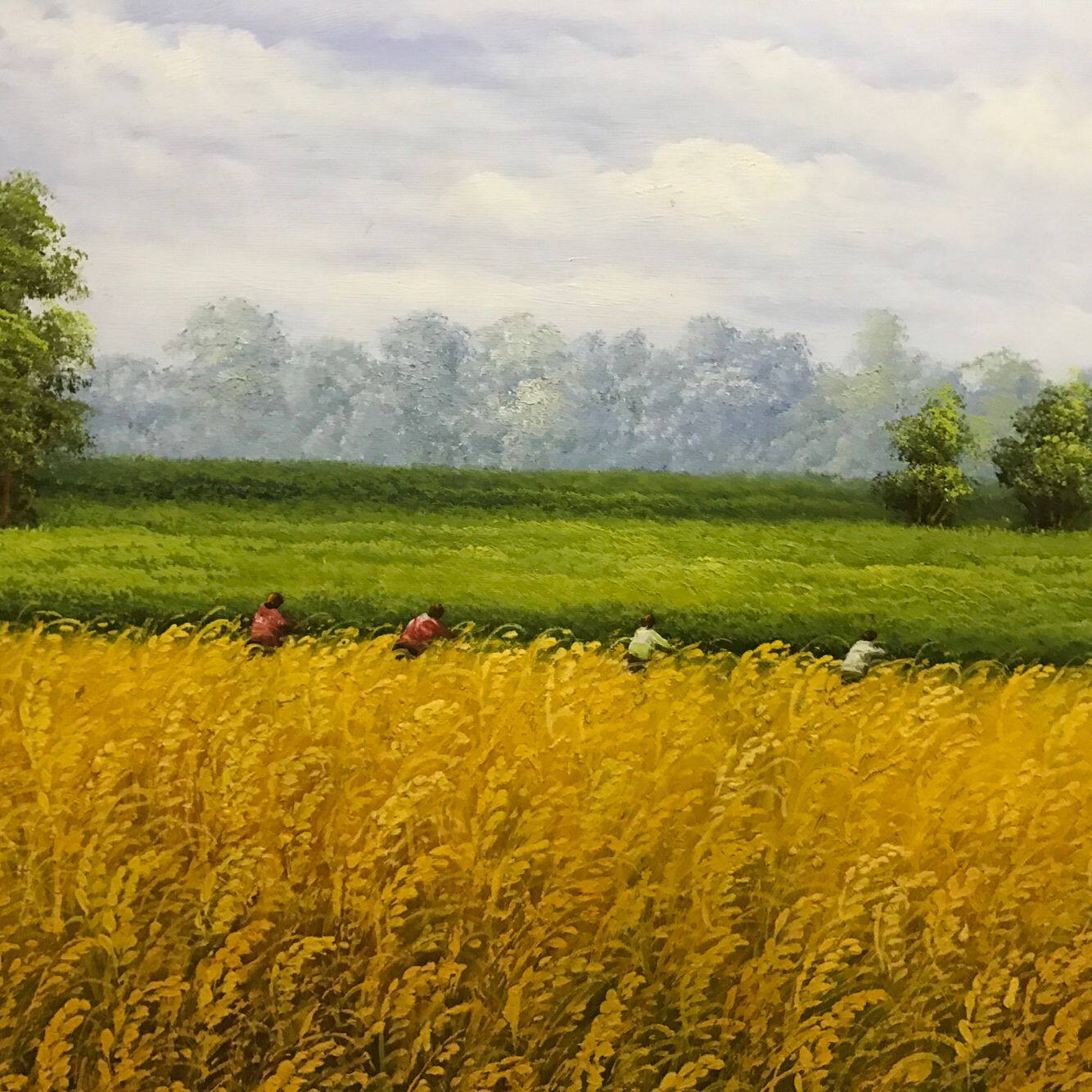 朝鲜油画 一级画家李成哲《收稻季节》劳动场面