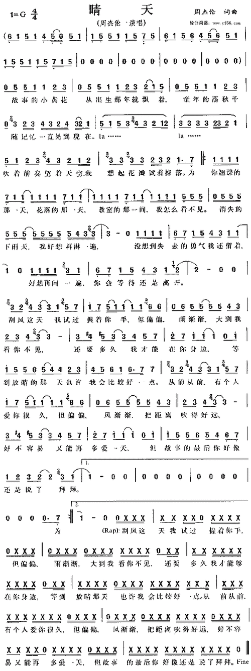 周杰伦晴天简谱,周杰伦晴天歌谱,周杰伦晴天歌词,曲谱,琴谱,总谱