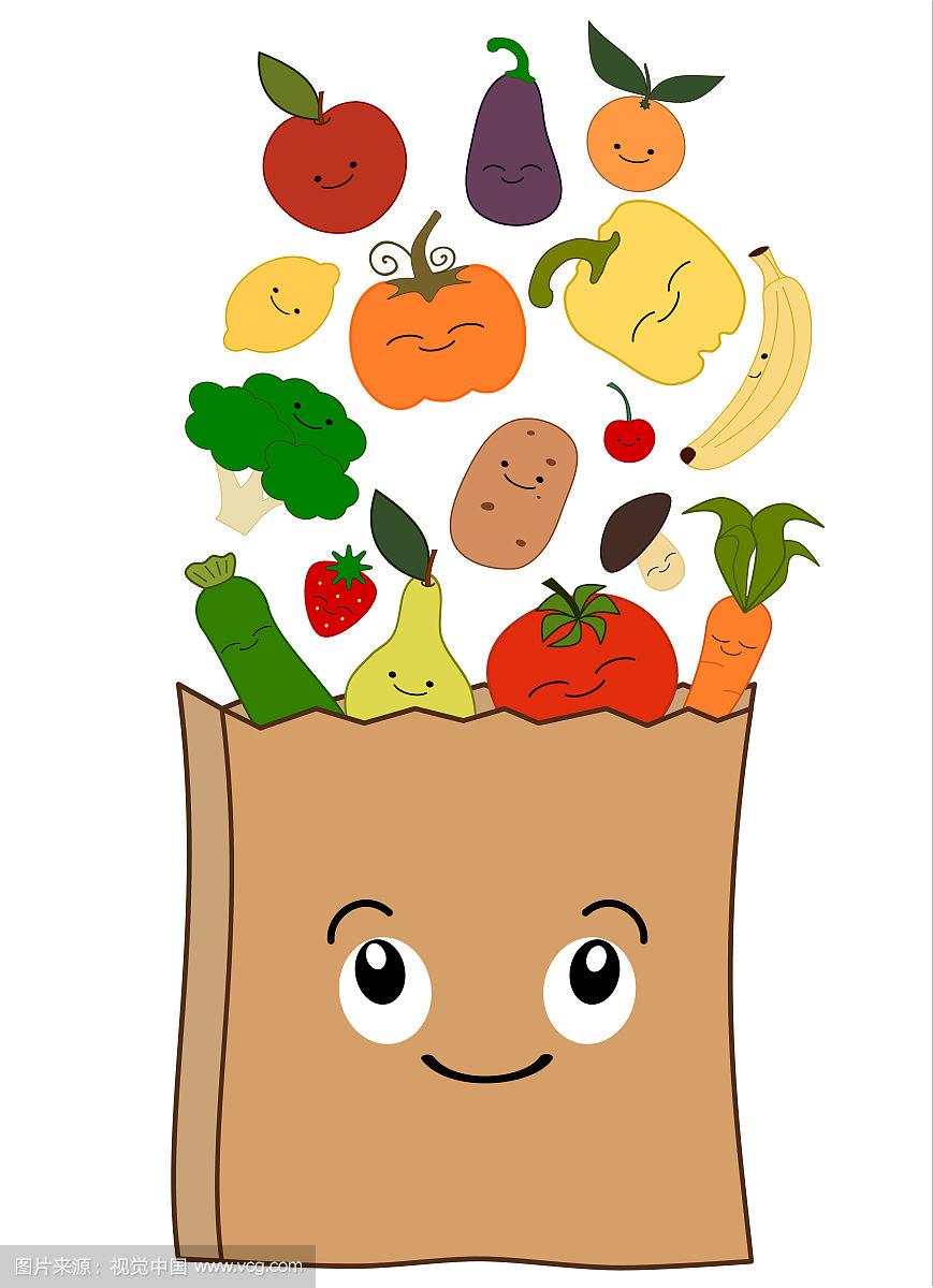可爱的卡通杂货袋与健康快乐的食物矢量概念插图