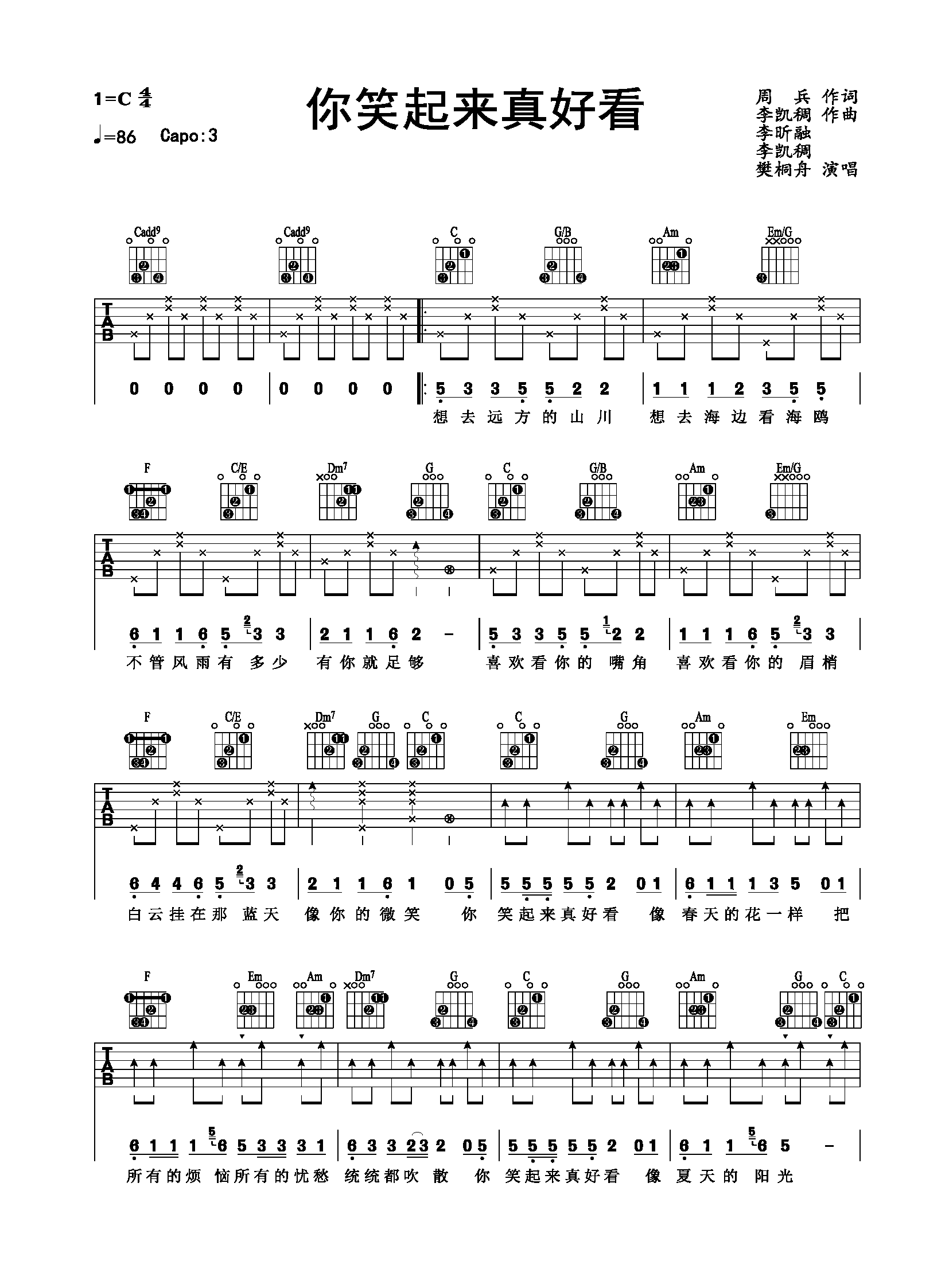 >>李昕融,樊桐舟,李凯稠,你笑起来真好看,原版完美吉他弹唱谱