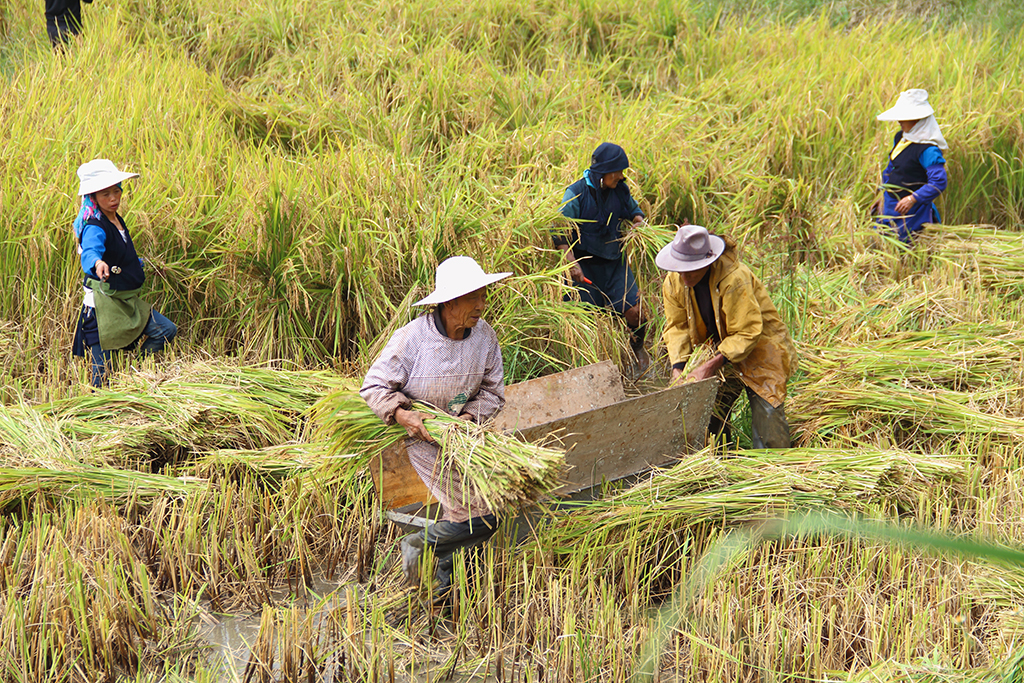金秋稻飘香农民收割忙 眼下正是收割稻谷的时节,元江县羊街乡戈垤村的