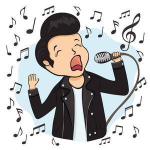 矢量歌手在蓝色西装与麦克风在白色背景.卡通人物照片