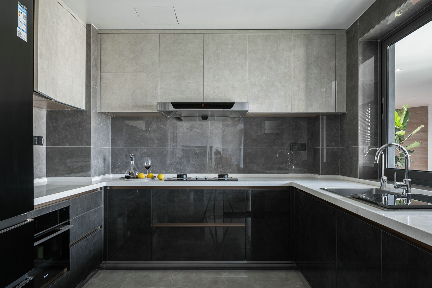 浅灰色哑光墙砖,黑色的石英石台面搭配白色定制橱柜更显空间干净明朗