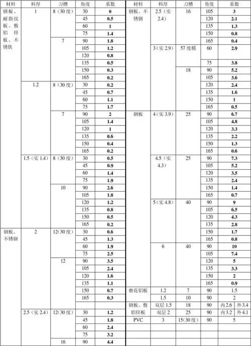 钣金折弯系数表