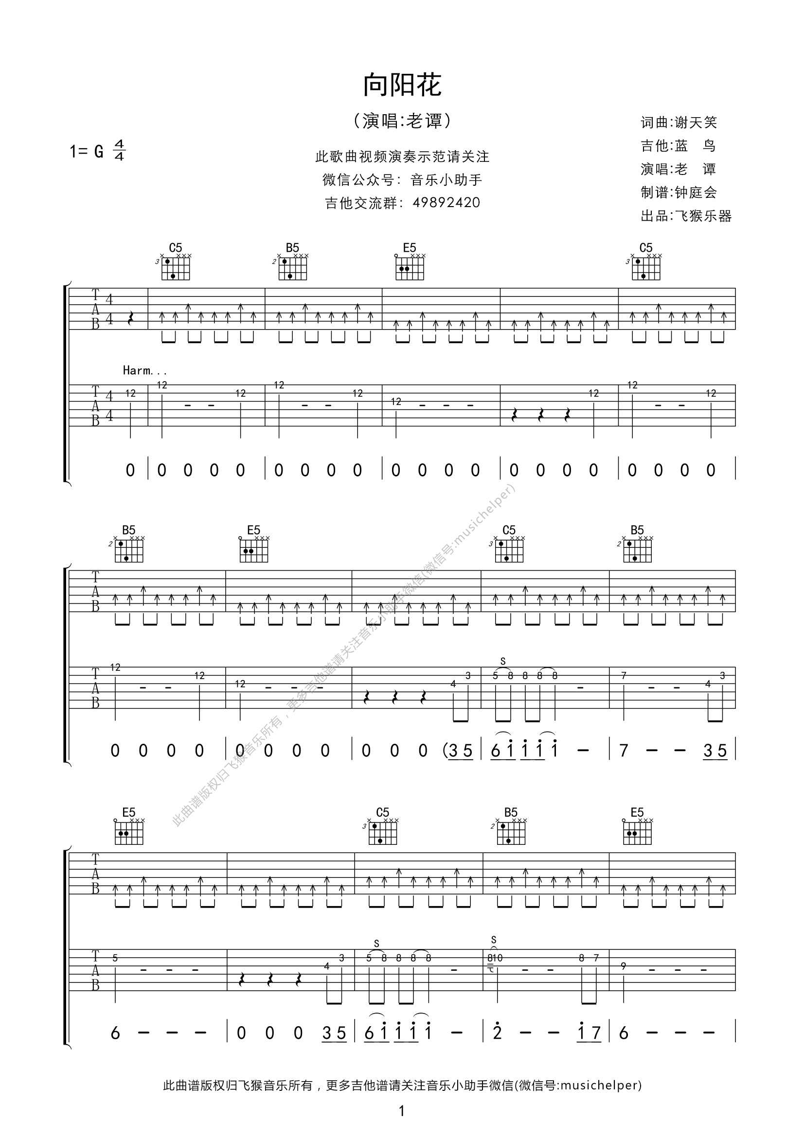 弹唱|飞猴乐器制作出品)吉他谱(图片谱,弹唱)_老谭_谢天笑-向阳花01