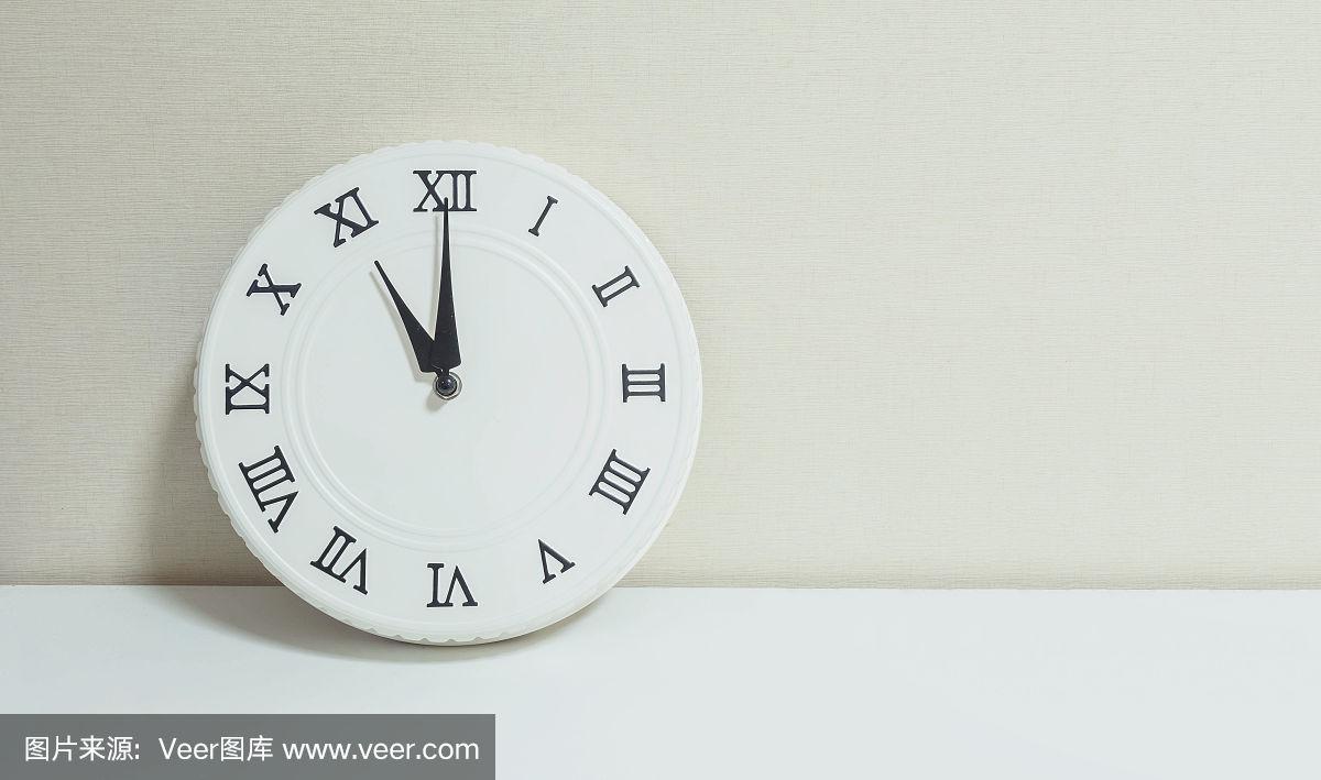 特写白色时钟装饰显示11点在白色木质桌子和奶油色壁纸纹理背景与复制