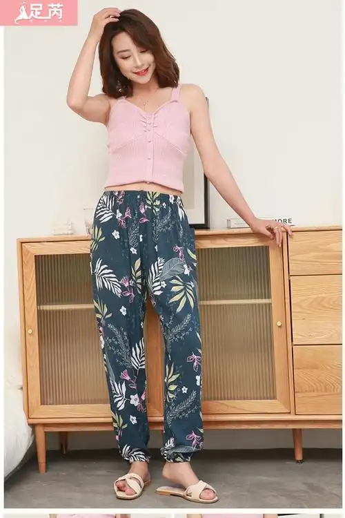 足芮女士夏季薄绵绸灯笼裤防蚊裤人造棉长款宽松加肥加大码家居裤黑色