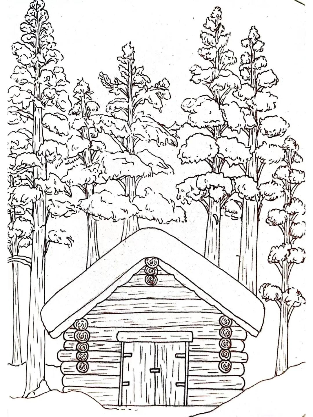 钢笔淡彩林中小屋