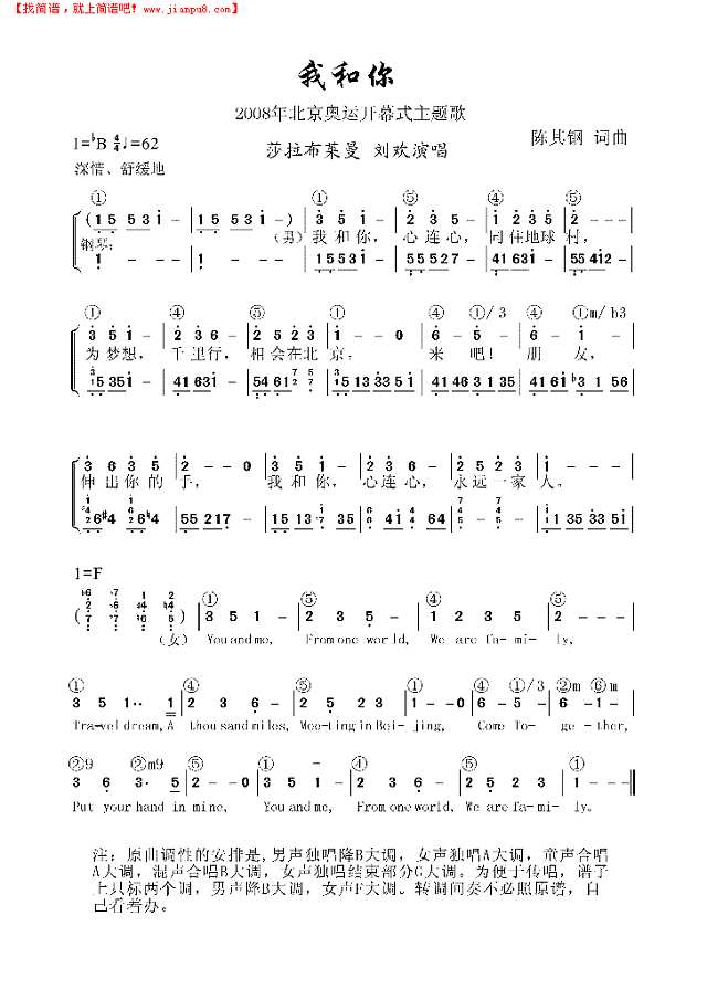 我和你——奥运会主题曲合唱谱 歌谱简谱网