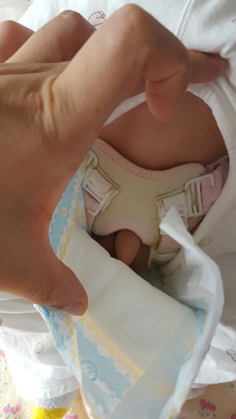 病史:早产儿,目前2 月,之前有鞘膜积液,近2日发现阴囊下面发红发黑