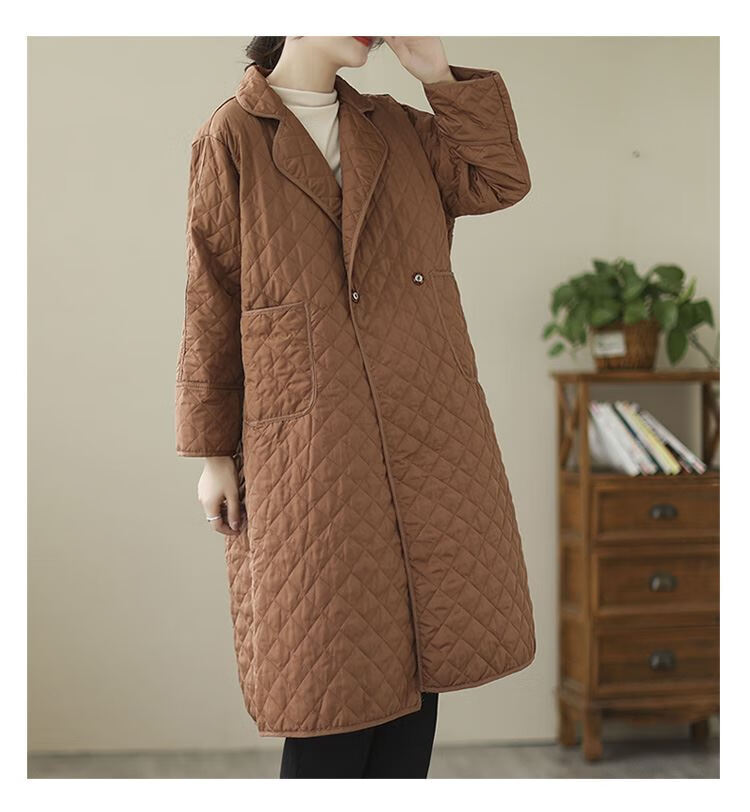 【特价捡漏】素订棉麻女装复古夹棉中长款棉服宽松加厚菱格棉衣外套冬