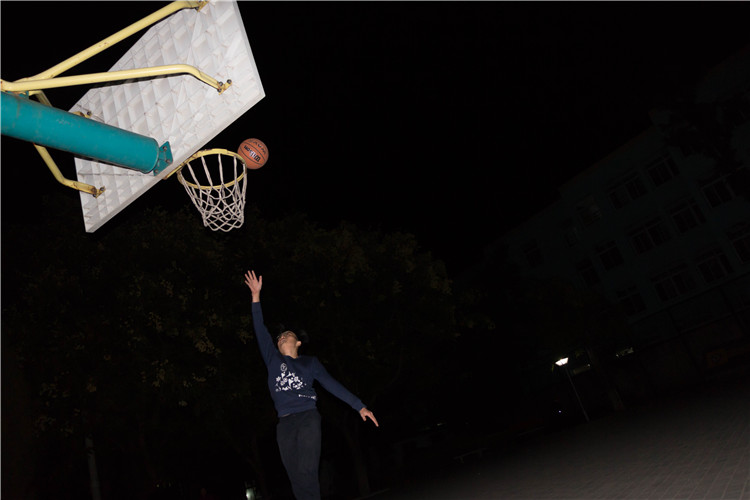 打球的照片,可以看到在深夜里,路上已经没有了一个人,空旷的篮球场上