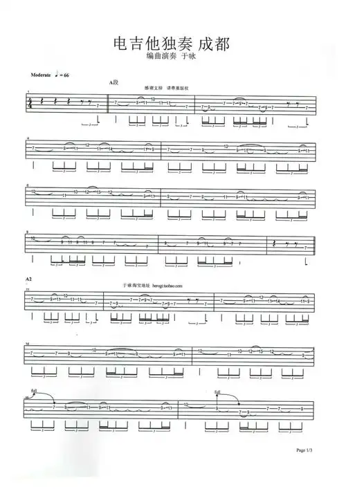 赵雷《成都》电吉他谱吉他谱简谱 - 曲谱歌词网