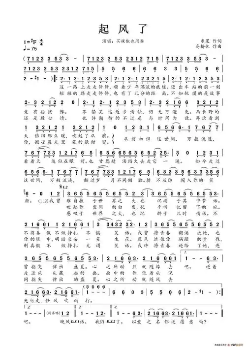 《起风了》简谱如下: 歌曲以升f调作为原调,节拍是4/4拍,歌曲节奏呈"