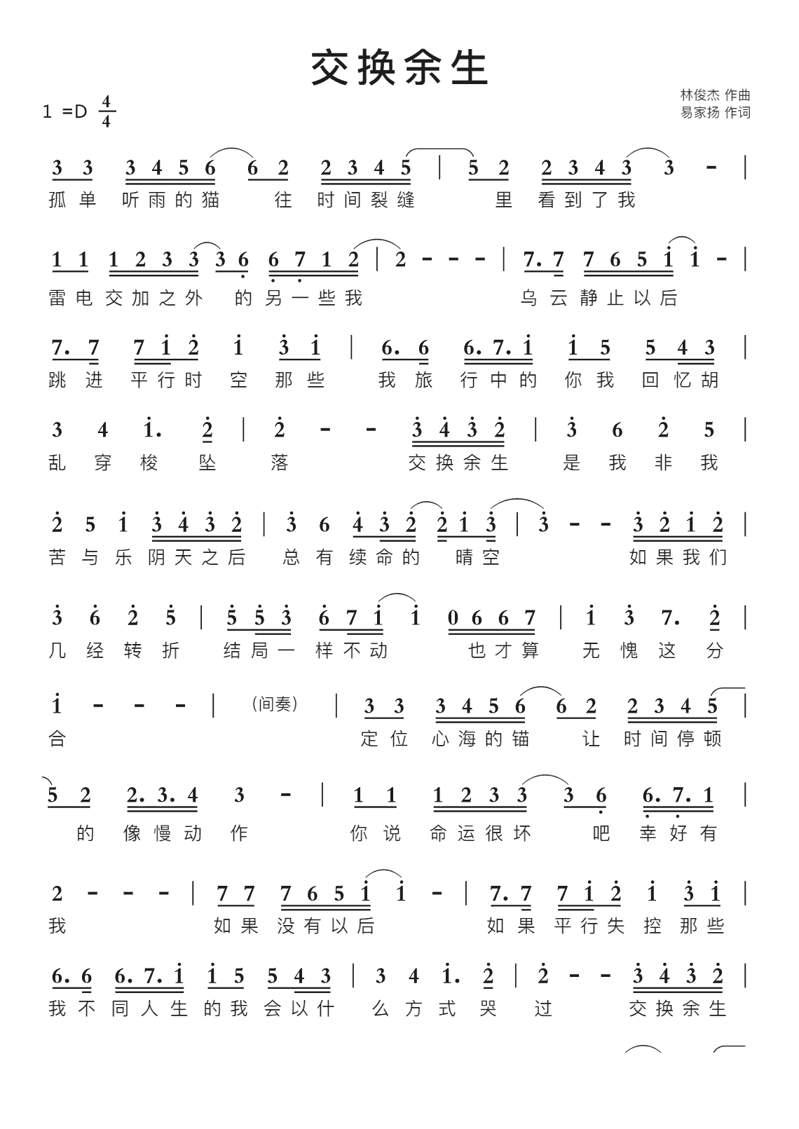 林俊杰-交换余生(双手简谱)d调钢琴谱