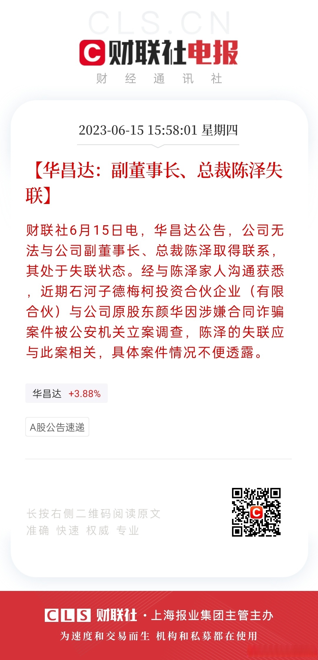 【华昌达:副董事长,总裁陈泽失联】财联社6月15日电,华昌达公告,公司