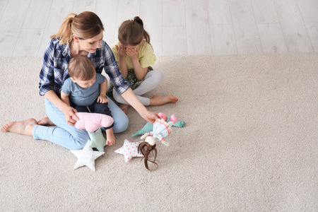 妈妈带着可爱的小孩子坐在舒适的地毯上在家照片