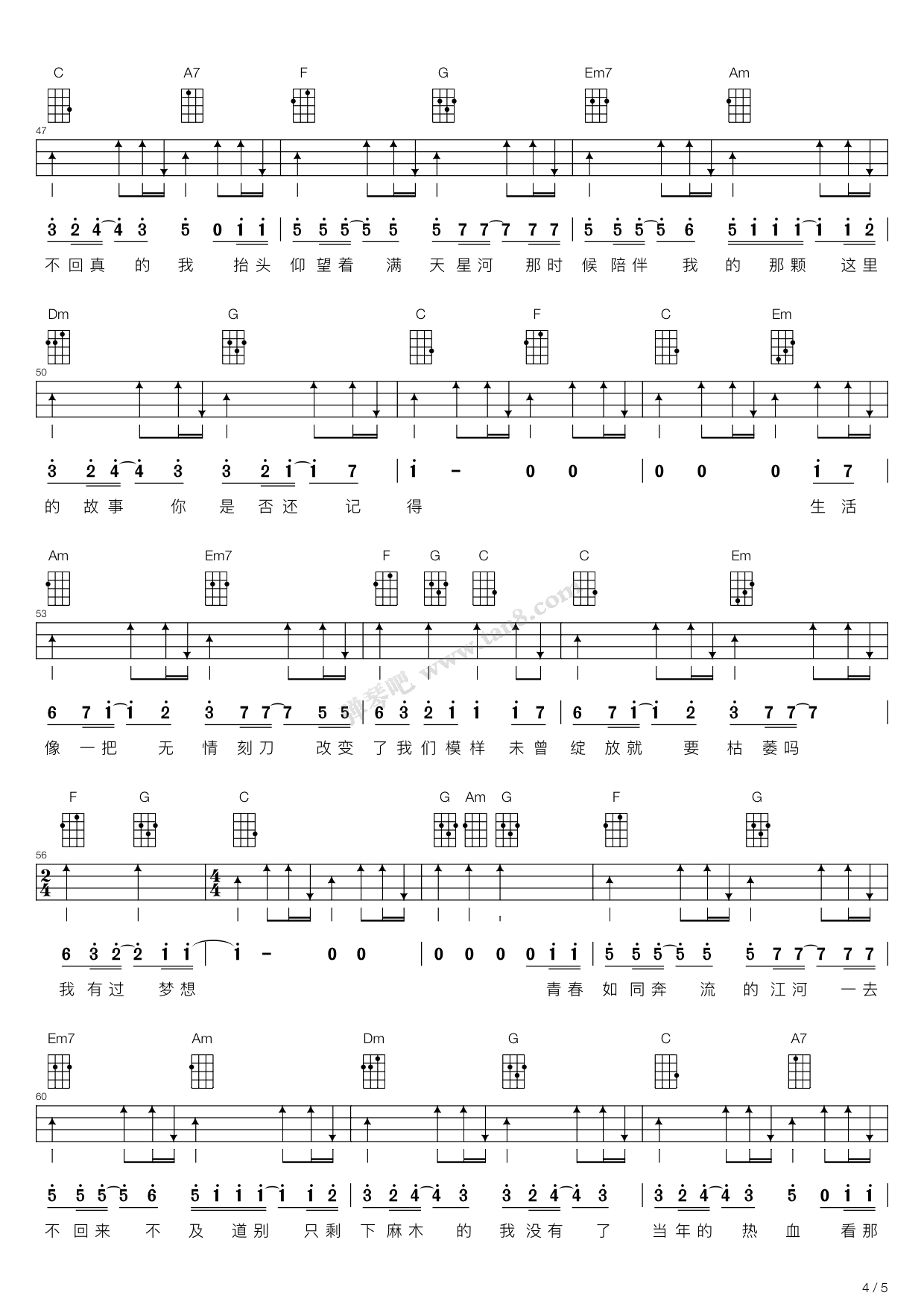 版本一 筷子兄弟《老男孩》尤克里里弹唱谱