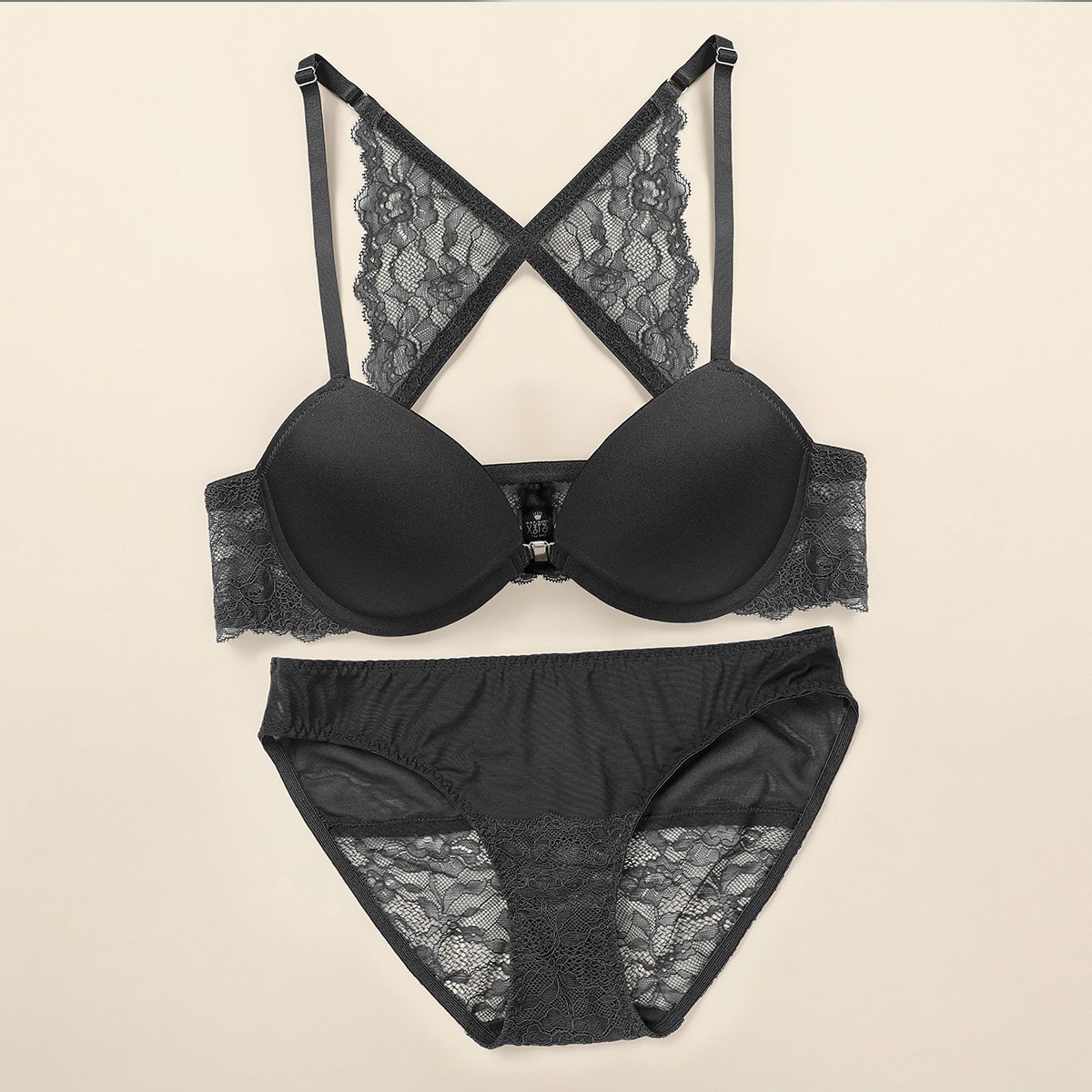 深v交叉前扣性感胸罩蕾丝聚拢女士美背内衣文胸套装