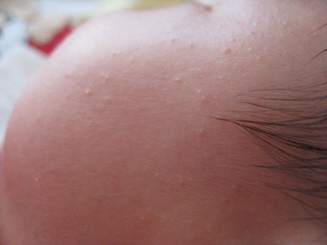 亲们,宝宝两个多月,额头上长满了针尖状的疙瘩,毛