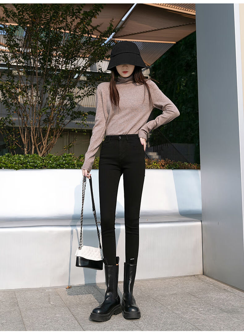 2022年秋季新款高腰黑色牛仔裤女显瘦修身小脚紧身秋冬加绒裤子