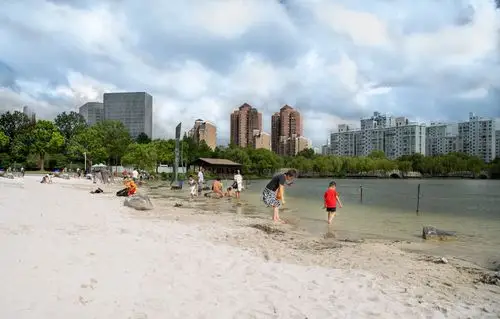 白色沙滩的湖边风光,中国上海市静安区大宁郁金香公园