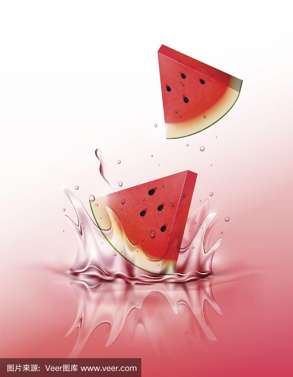 切片西瓜滴在果汁上溅起涟漪,矢量插图