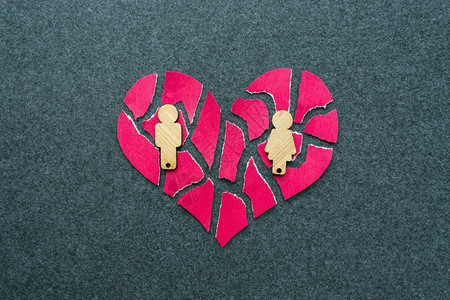 破碎心卡通分手离婚失灵的关系概念碎裂马赛克粉红色的心和灰背景男女