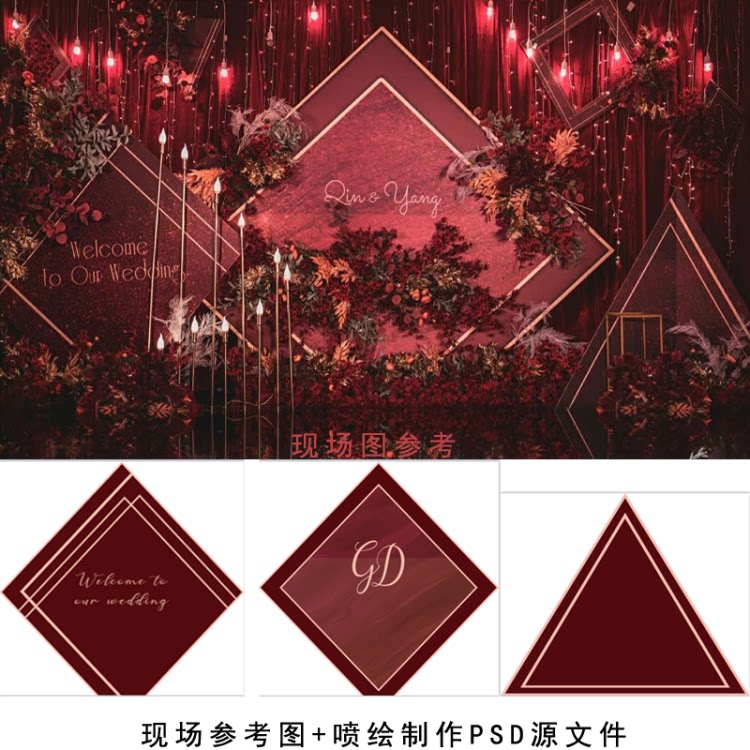 jp22酒红色简约创意婚礼背景psd素材 婚庆设计喷绘kt板舞台背景