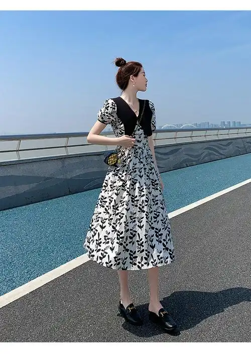 魅斑法式娃娃领连衣裙2022年新款韩版夏季高腰显瘦印花感茶歇裙子图片