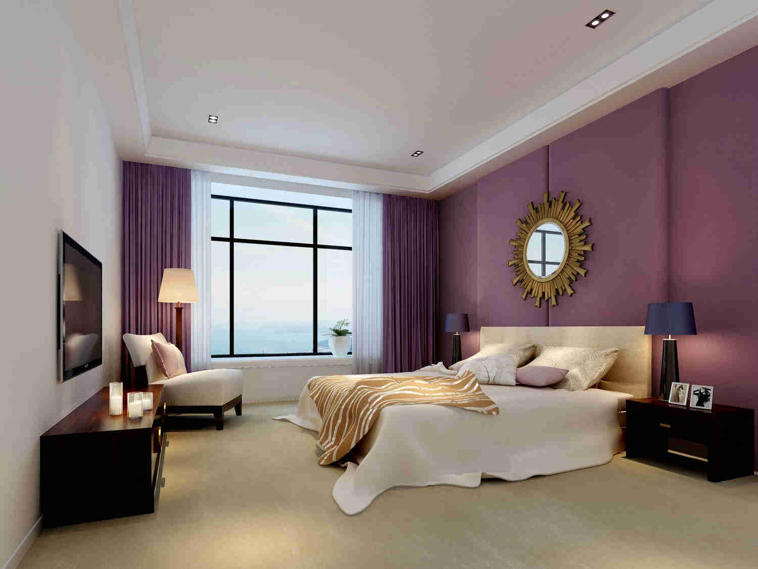这个卧室主要的颜色就是紫色与白色,虽然紫色看起来较为厚重,但是因为