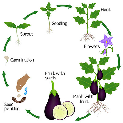 着色页面茄子具有根系的生命周期从播种到开花和结果的茄子的生长阶段