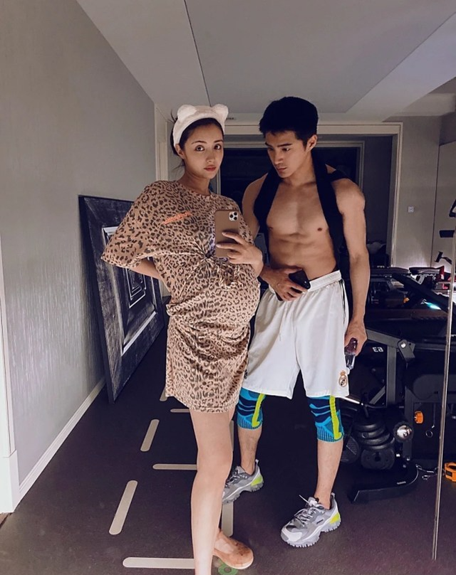 麦迪娜孕晚期和姜潮一同健身,孕肚大的像怀双胞胎,四肢依旧纤细