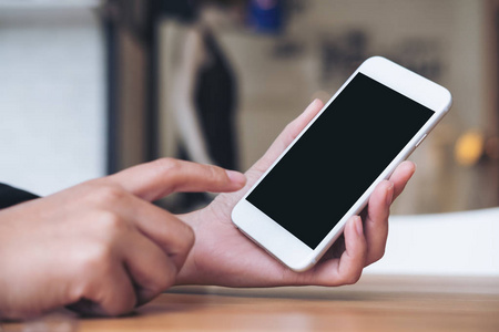 在现代咖啡馆里手持并指着白色手机的女性手的样机图像照片