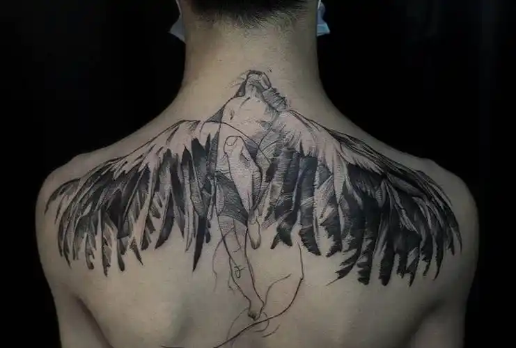 男生背部黑灰素描点刺技巧创意天使翅膀纹身图案