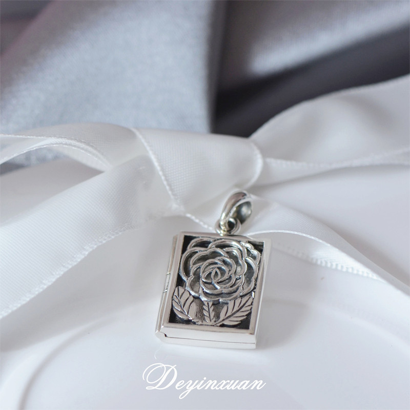 s925纯银泰银玫瑰花朵方形可打开放照片相片盒子吊坠锁骨短款项链