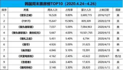 票数据韩国影院出现确诊者未影响市场热度回升本土片洁白侵入者包揽