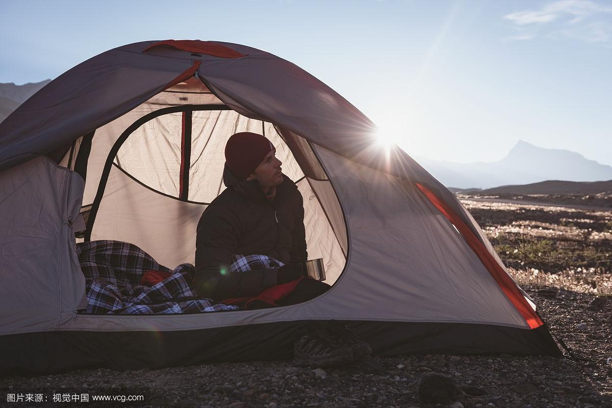 男人躺在帐篷里的照片