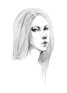 一个年轻漂亮的女孩的肖像素描,长直发,可爱的女孩铅笔画.照片