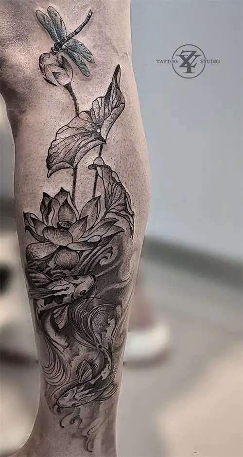 周忆刺青 小腿纹身 小腿荷花纹身 北京三里屯纹身