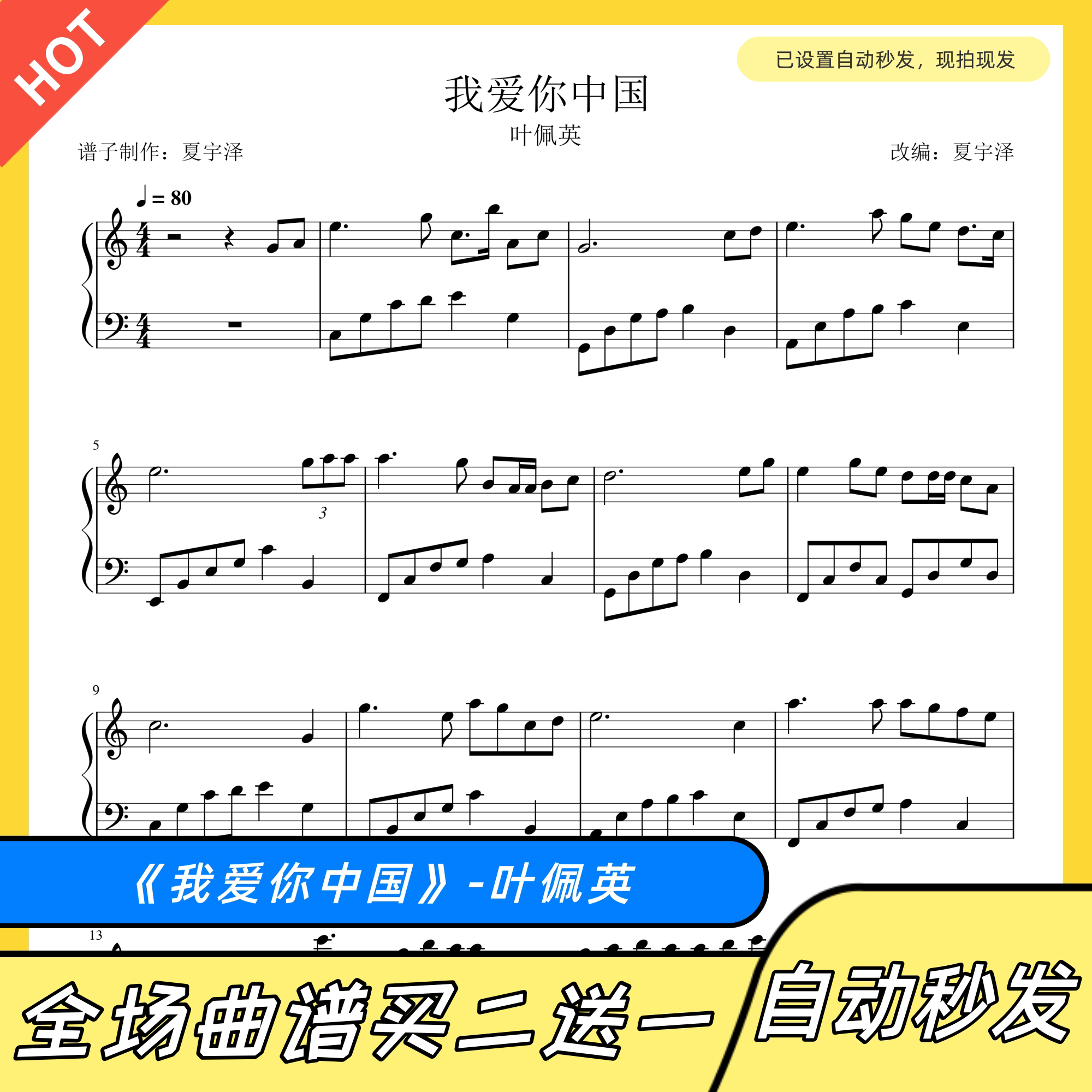 我爱你中国 钢琴谱 五线谱 电子版 独奏 正谱 叶佩英 c调
