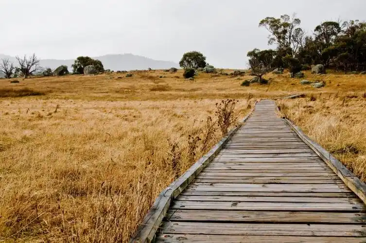 褐色的木制走道之间的棕色的田野高清壁纸